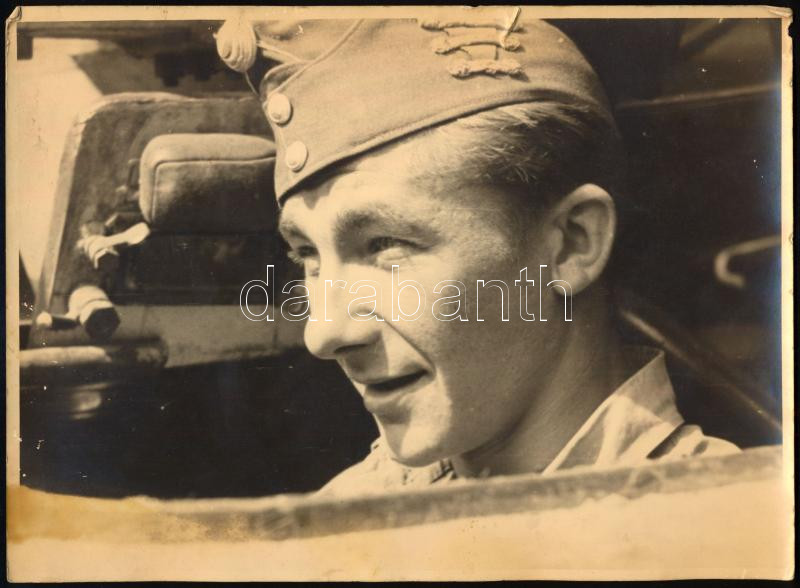cca 1940 A M. Kir. Honvédség egy katonája kinéz egy páncélozott harcjárműből, nagyméretű fotó, szélén kis sérülésekkel, 17,5x24 cm