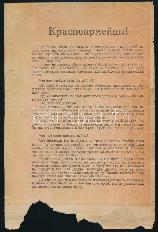 cca 1942 A Vörös Hadsereg katonáinak szóló német II. világháborús röplap, orosz nyelven, sérült, 22,5x15 cm. Kézdi-Kovács László (1864-1942) festőművész hagyatékból, hátulján német birodalmi sas