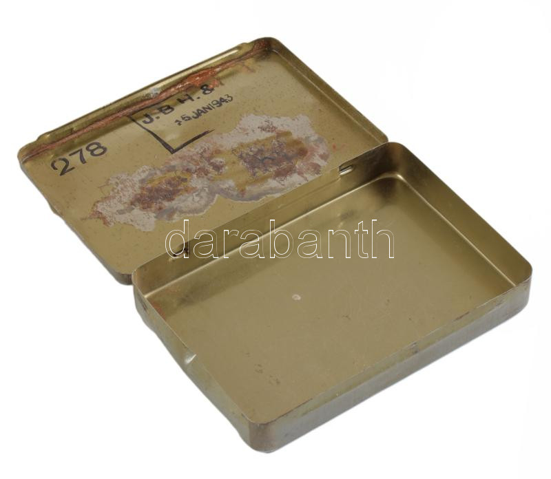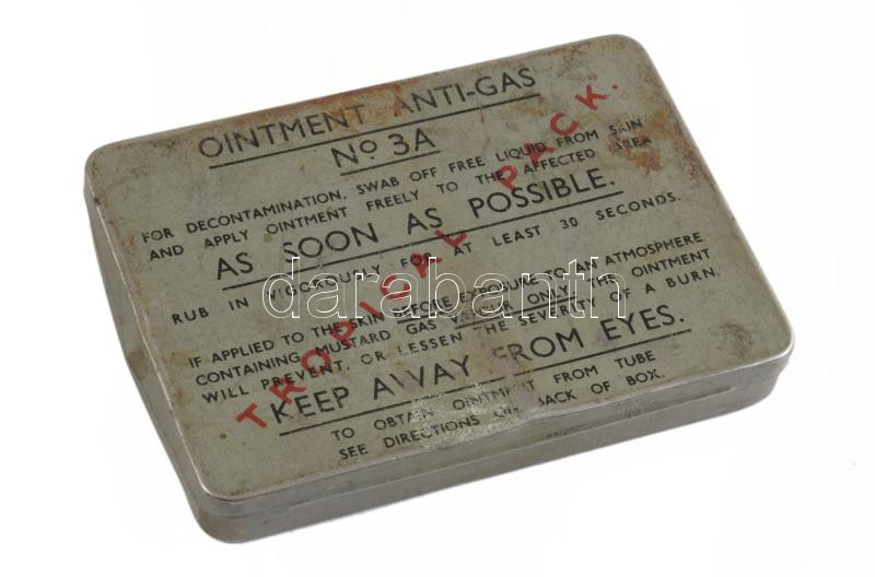 cca 1943 Ointment Anti-Gas No. 3A (Tropical Pack), a brit hadsereg katonái számára biztosított, harci gázok (mustárgáz) elleni kenőcs fémdoboza, a dobozon angol nyelvű használati utasítással, kissé viseltes állapotban, 11x7,5x1,5 cm