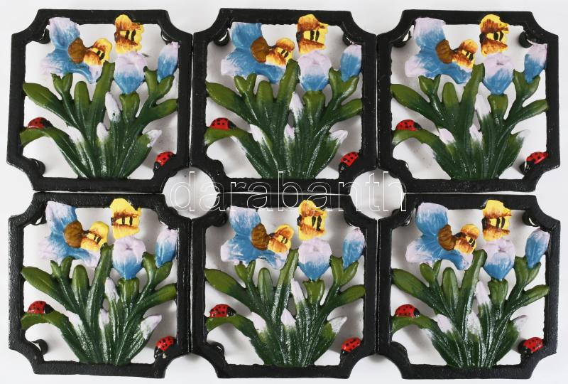 6 darab szecessziós stílusú öntöttvas edényalátét, virág- és bogármintákkal festett, 10,5x10,5 cm, nagyobb alátétté is összerendezhetőek, hibátlan.