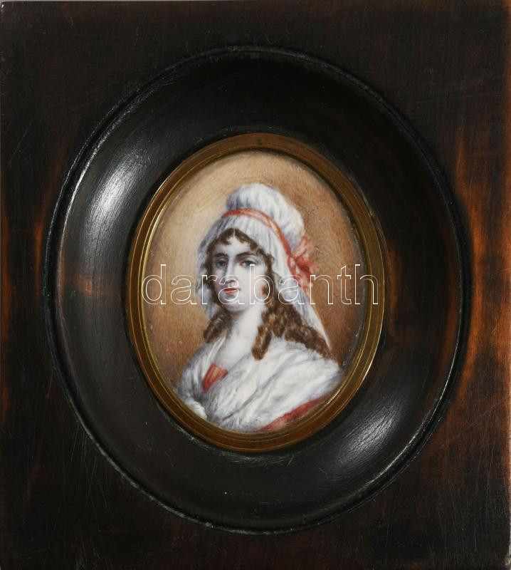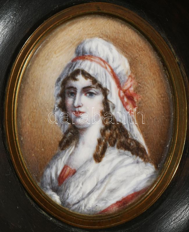 Antik festett női portré miniatúra, keretben, 11x10 cm