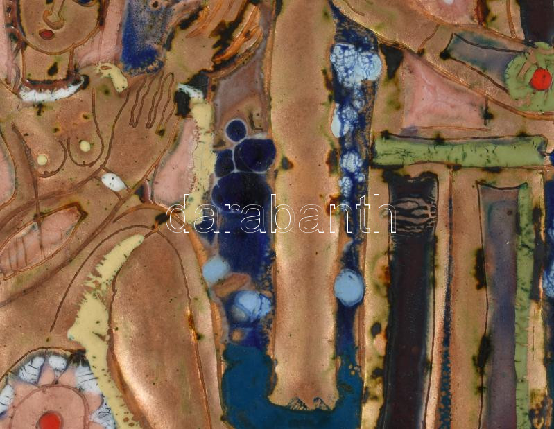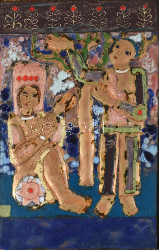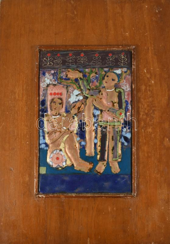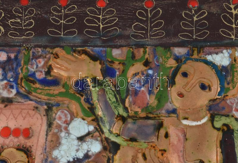 Fajka János (1935-): Gyümölcsösben. Tűzzománc kép réz alapon, jelzett, fa keretben, 22,5x14 cm, 40x27 cm