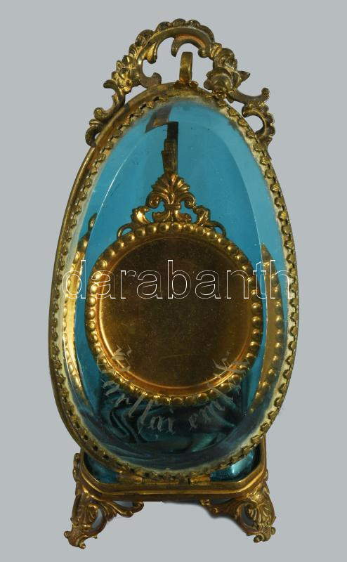 cca 1900 Réz szerelékes kéküveg zsebóra tartó, m: 11,5 cm