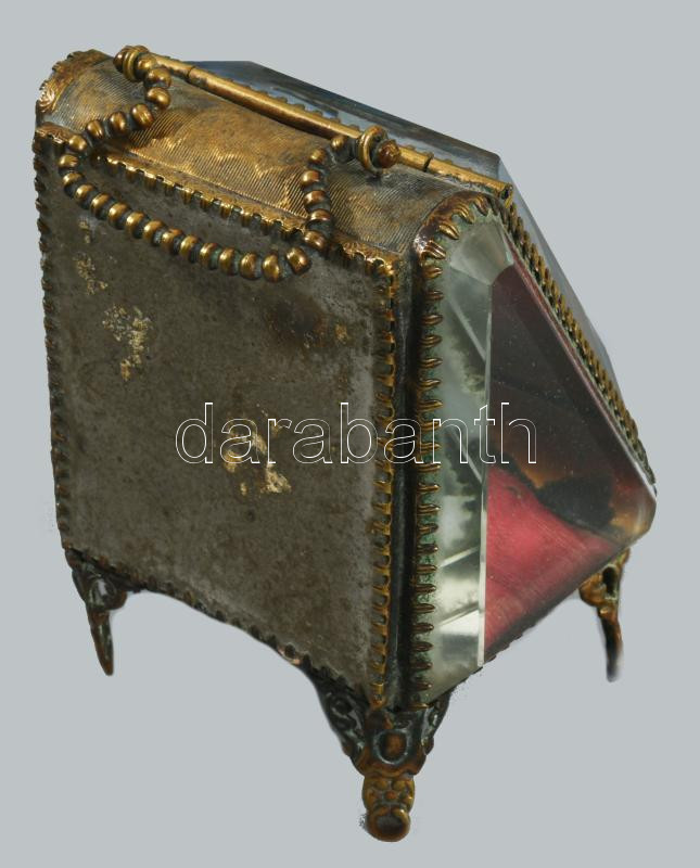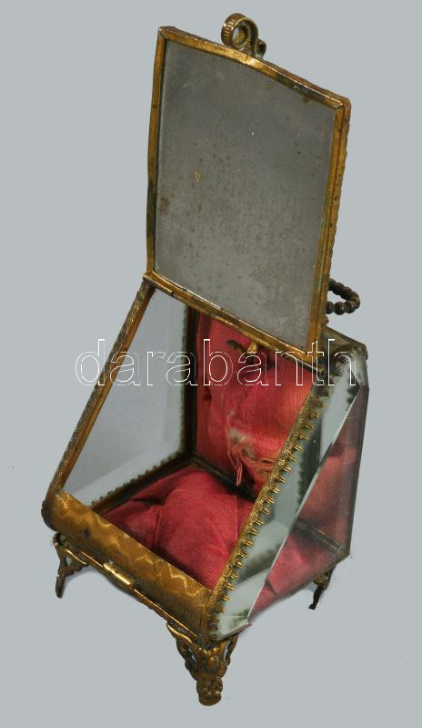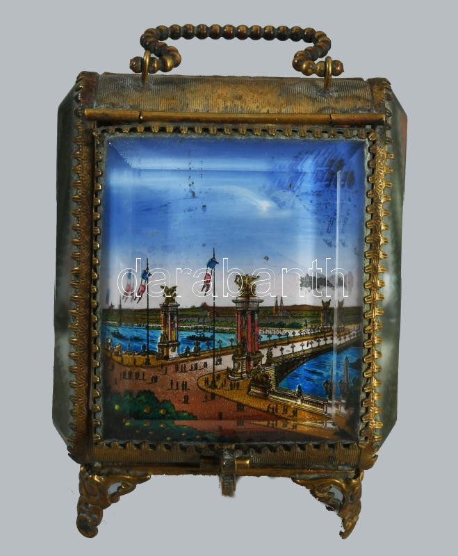 cca 1900 Réz szerelékes városképes zsebóra tartó, m: 9 cm