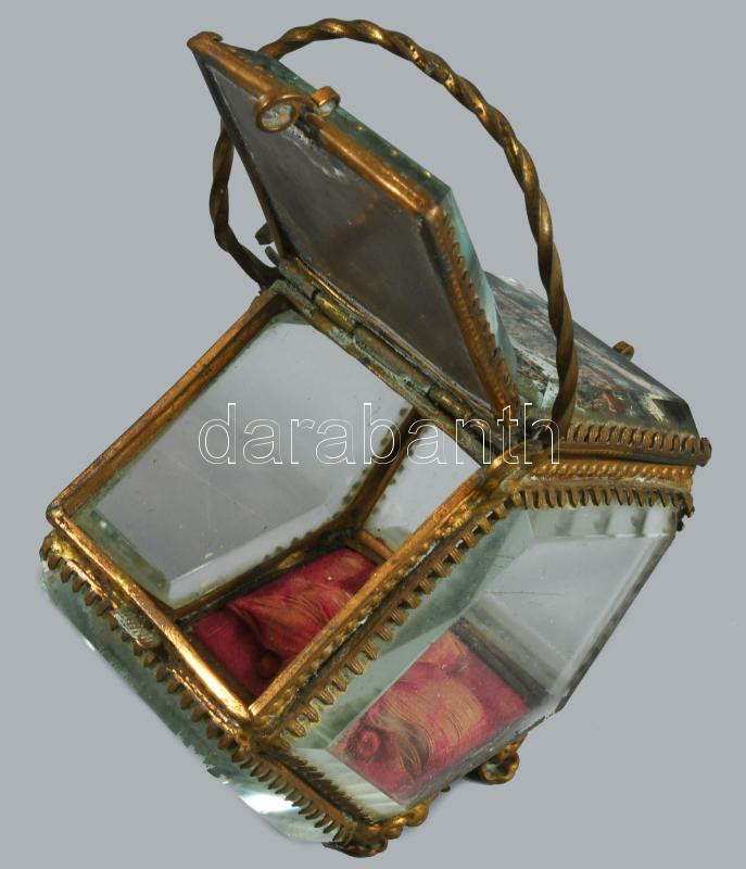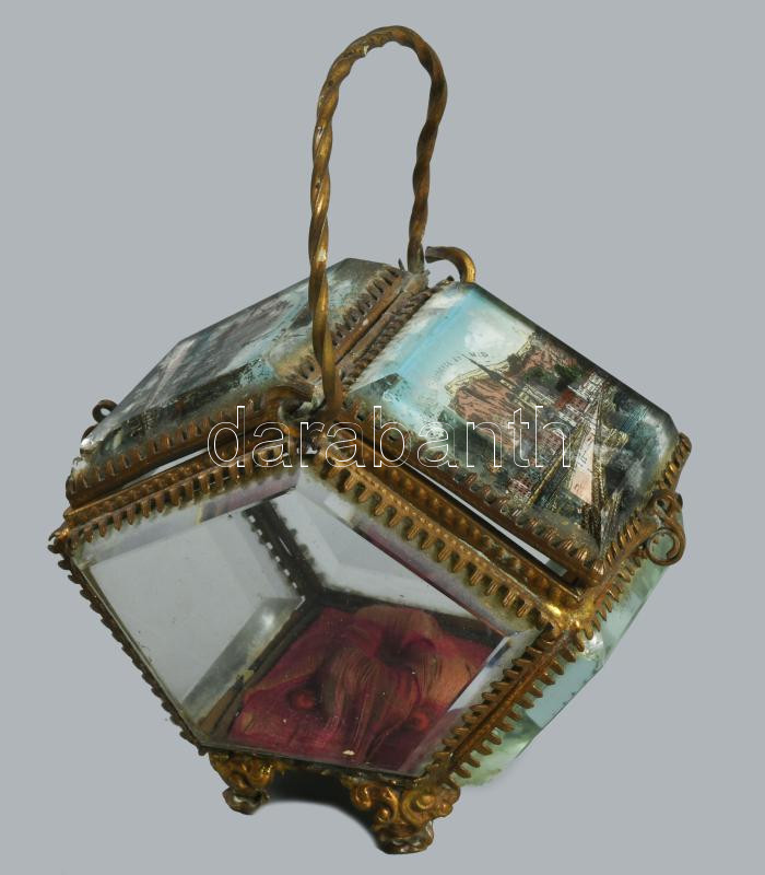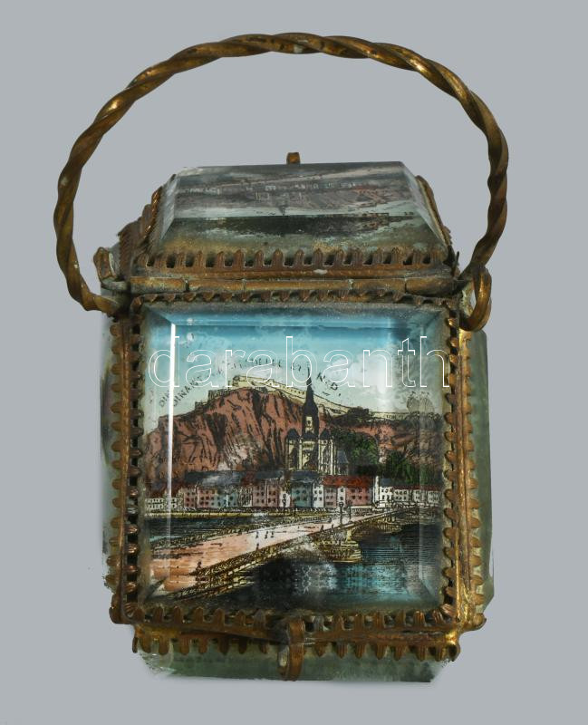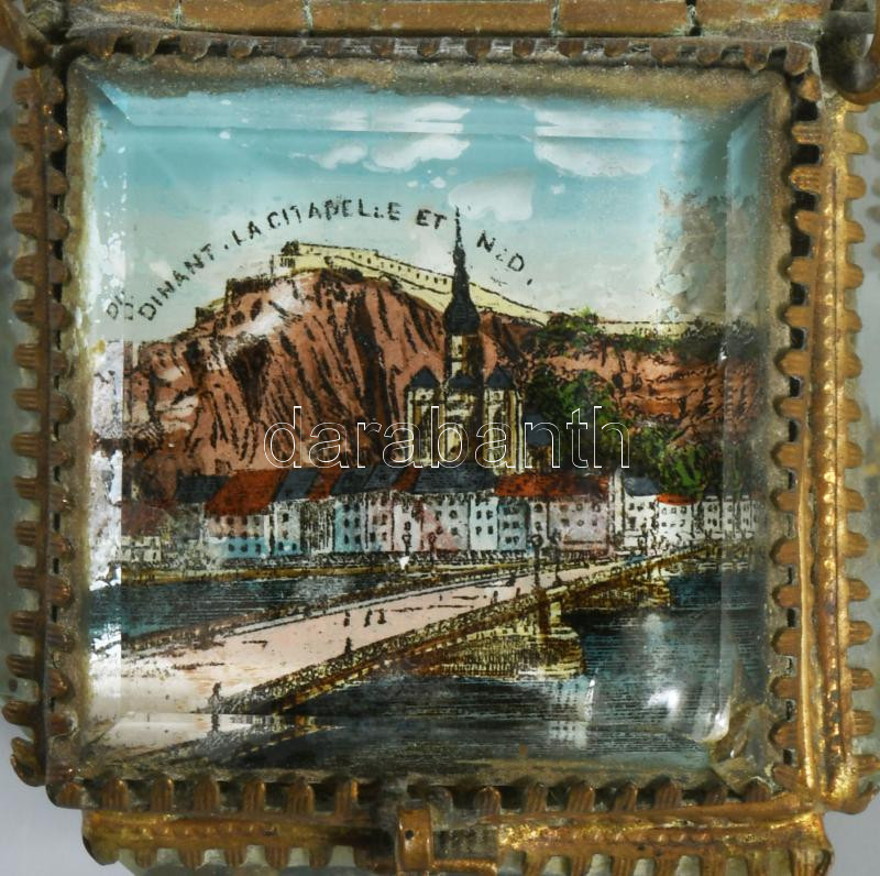 cca 1900 Üveg lapos városképes ékszertartó, sérüléssel, m: 13 cm