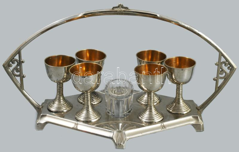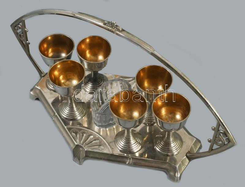 cca 1920 Szecessziós italos készlet, 6 pohárral, középen üveg betéttel, 31x16 cm