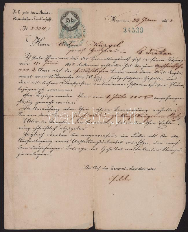 1858 Bécs, cs. kir. szab. osztrák Államvasút-Társaság (k. k. priv. österr. Staats-Eisenbahn-Gesellschaft) főtitkára által kiállított német nyelvű irat, 15kr okmánybélyeggel, sérülésekkel