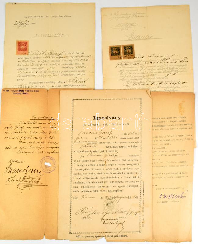 1906-1926 Novák József m. kir. posta- és távirdakiadó 5 db irata, közte igazolvány hivatali eskü letételéről; beköltözési engedély a trianoni békeszerződés után Alsószalánkról (Felvidék) Kispestre; igazolvány a M. Kir. Folyamőrség Rádióiskolájánál számvivőként teljesített szolgálatáról; stb., vegyes állapotban