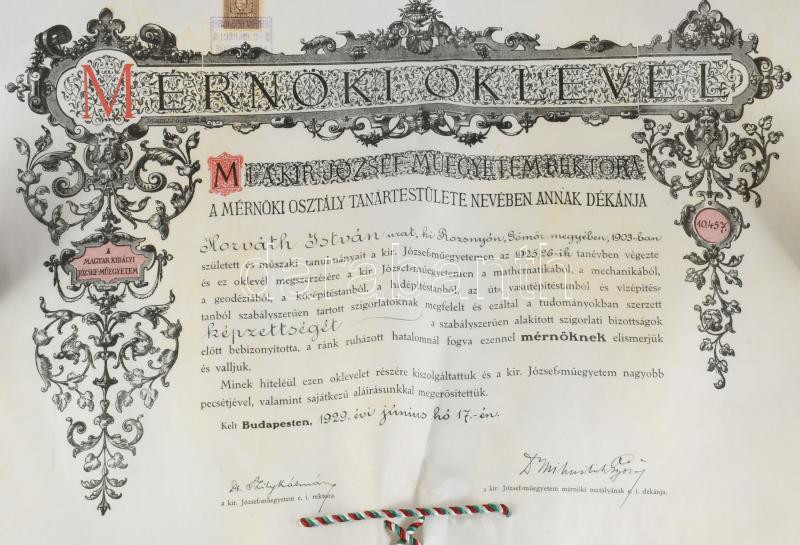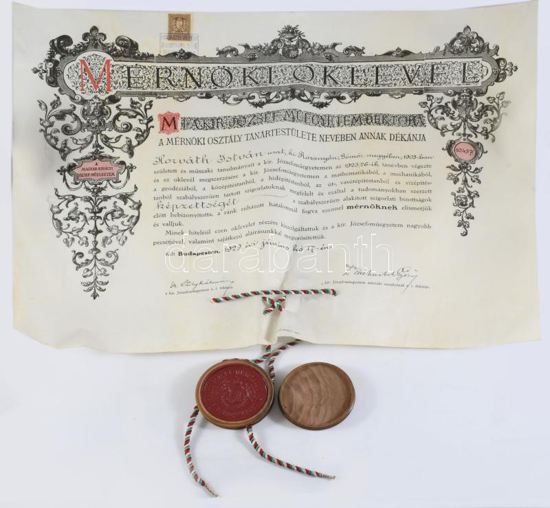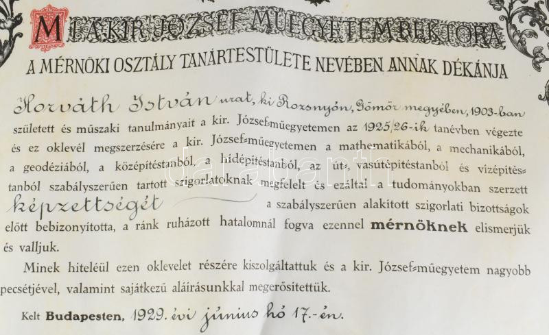 1929 Mérnöki oklevél függő viaszpecséttel