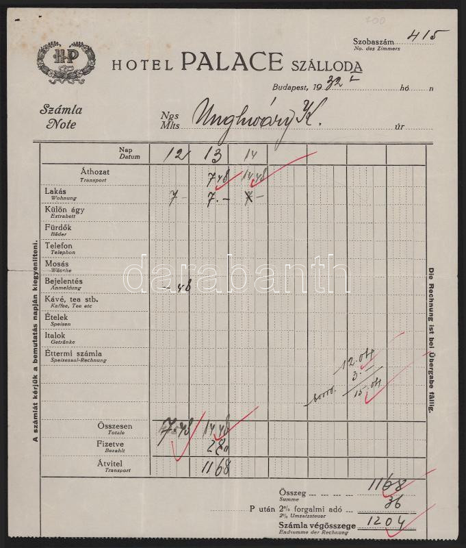 1932 Bp., Hotel Palace Szálloda fejléces számlája