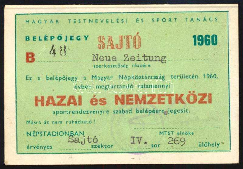 1960 Népstadionba szóló sajtóbelépő hazai és nemzetközi sportrendezvényekre