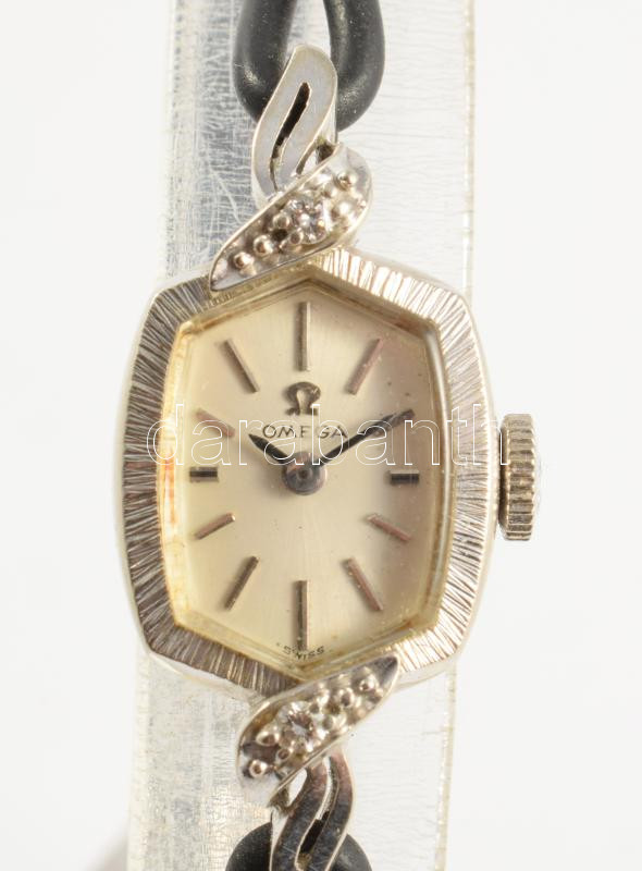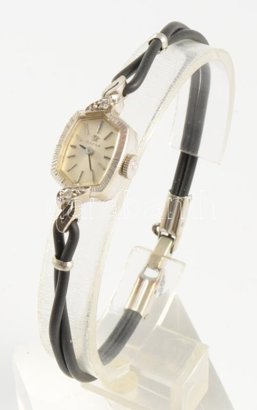 Omega 14K fehérarany (Au) női karóra. Kézi felhúzós szerkezettel. jelzett, bőr szíjjal 12x20 mm
