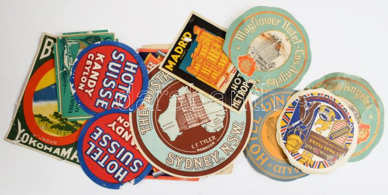 14 db klf háború előtti vegyes hotelcímke, bőröndcímke rossz állapotban / 14 vintage pre-war international hotel labels, luggage labels in bad condition