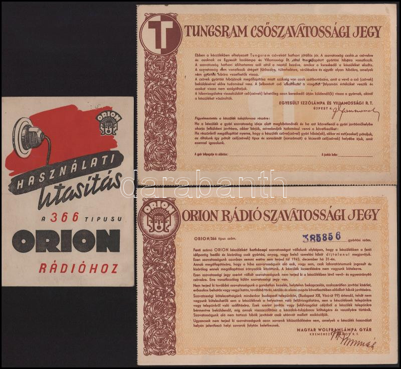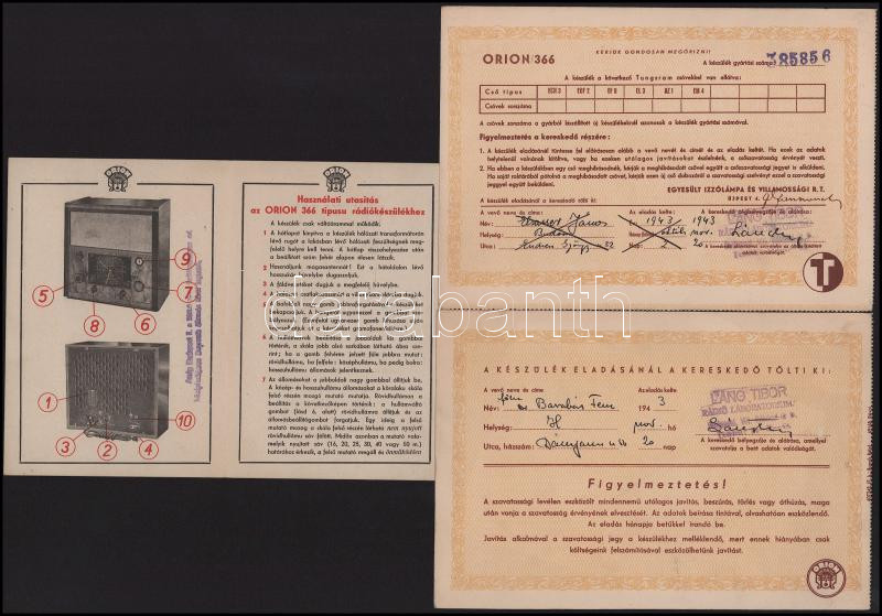 1943 Orion 366 rádió használati utasítása képpel, két kihajtható lap, a rádió és a hozzá tartozó Tungsram rádiócső kitöltött szavatossági jegye, össz. 3 db