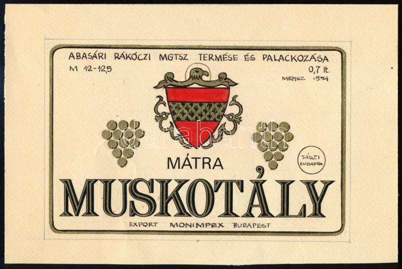 1971 Mátra muskotály, Abasári Rákóczi MGTSZ termése és palackozása, kézzel rajzolt/festett borcímke terv, jelzett a hátoldalon, 11x16,5 cm