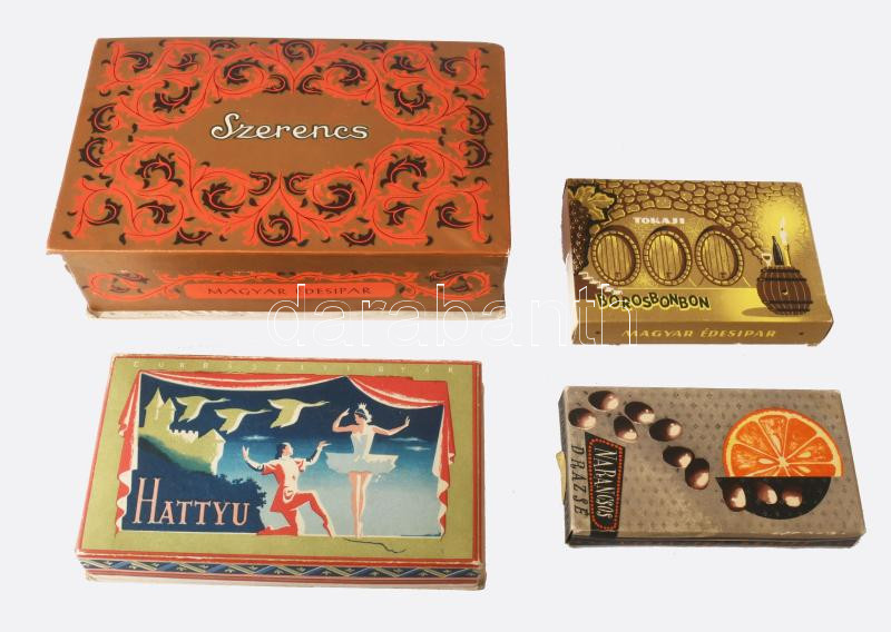 4 db retró desszertes doboz: Tokaji boros bonbon, Narancs drazsé, Hattyú, Szerencsi Arany bonbon, 12x6,5x2 cm és 19,5x12,5x6 cm között