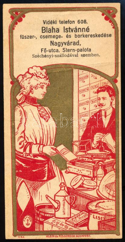 Blaha Istvánné fűszer-, csemege- és borkereskedés Nagyvárad szecessziós számolócédula, hajtott
