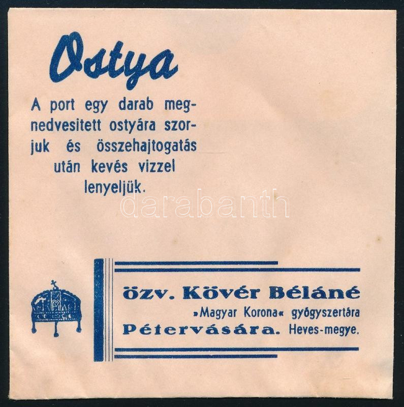 cca 1930 Pétervására, Özv. Kövér Béláné "Magyar Korona" gyógyszertára receptboríték