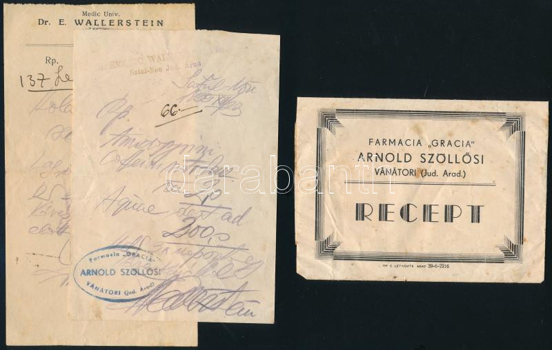 cca 1930 Szöllősi Arnold aradi gyógyszertárának receptborítéka, benne Dr. Wallerstein Imre aradi orvos két receptje