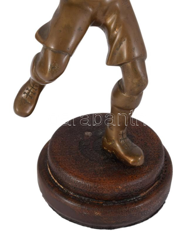 Antik bronz labdarúgó szobor, fa talapzaton, 22,5 cm