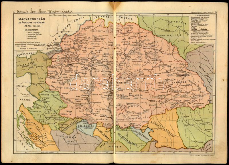 1939 Barthos - Kurucz: Magyarország történelmi atlasza. Bp., 1939, M. Kir. Honvéd Térképészeti Intézet, 16 p. Kiadói tűzött papírkötés, kissé foltos, hullámos.