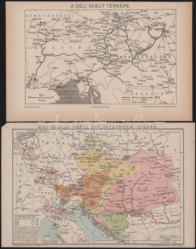 cca 1900 A Déli vasút térképe, Pallas Nagy Lexikona, Bp., é.n., Pallas, szakadt, 15×24 cm + caa 1900 Historische Karte von Österreich-Ungarn, Brockhaus' Konversations-Lexikon, 16x25 cm