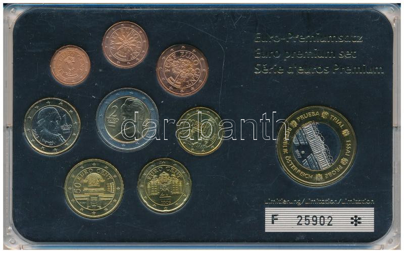 Austria 2002-2006. 1 Cent - 2 Euro (8xdiff) coin set in plastic case + 2004. 1 Euro trial strike C:UNC,AU