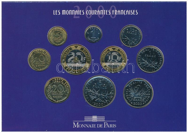 France 2000. 1 Centime - 20 Francs (10xdiff) coin set in cardboard case C:UNC the gluing of the case is loose