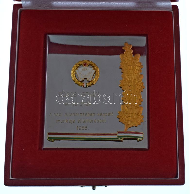 1986. "Népi Ellenőrzés" műgyantás, bronz jelvény, rátétes, krómozott, névre szólóan gravírozott plaketten, eredeti tokban (105x89mm) T:AU