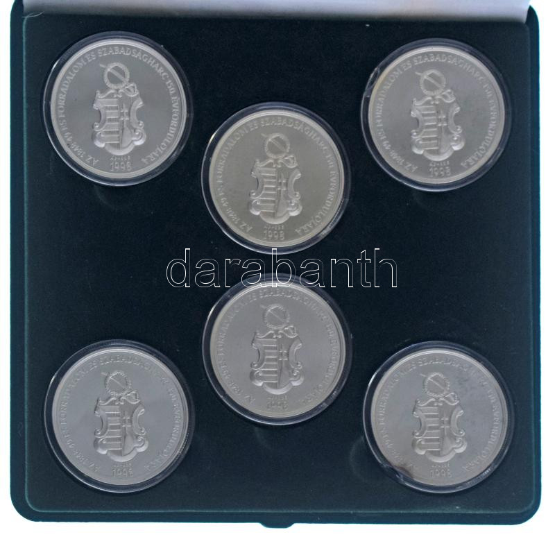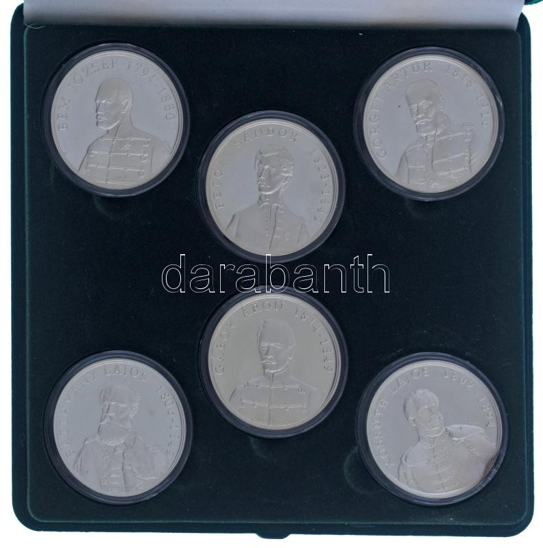 Csóka Zsuzsanna (1962-) 1998. "150. évfordulóra kibocsátott, az '1848-as magyar forradalom nagyjai éremsorozat" hat darab, jelzett Ag emlékérme, kapszulában: Kossuth Lajos, Batthyány Lajos, Görgei Artúr, Bem József, Gábor Áron, Petőfi Sándor. Közös dísztokban, sorszámozott "00158"-as tanúsítvánnyal (érmenként ~35,1g/0.925/42,5mm) T:PP egy-egy érme kis fo. vagy patina