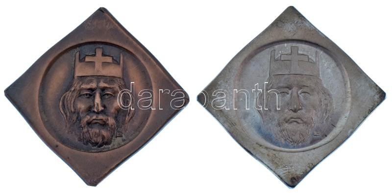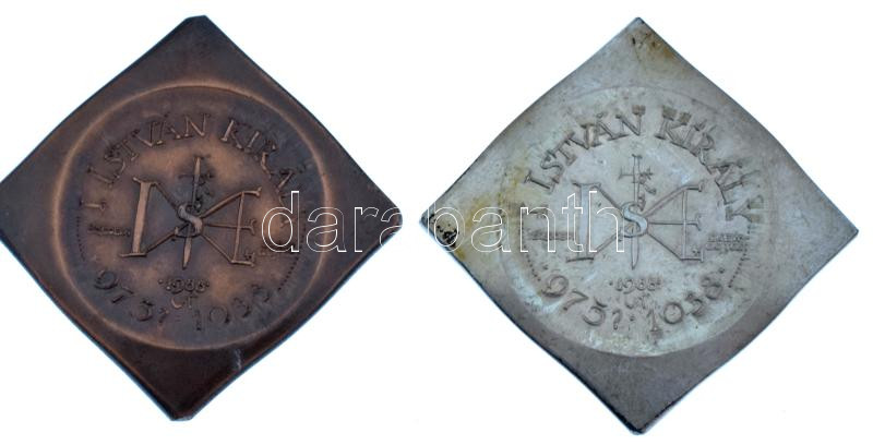 Lapis András (1942-) 1988. "I. István király 975?-1038 - Szegedi Éremgyűjtők" (2xklf) kétoldalas, csegely alakú Ag és bronz emlékplakett pár (Ag: 18,31g / 34x34mm) T:AU, patina
