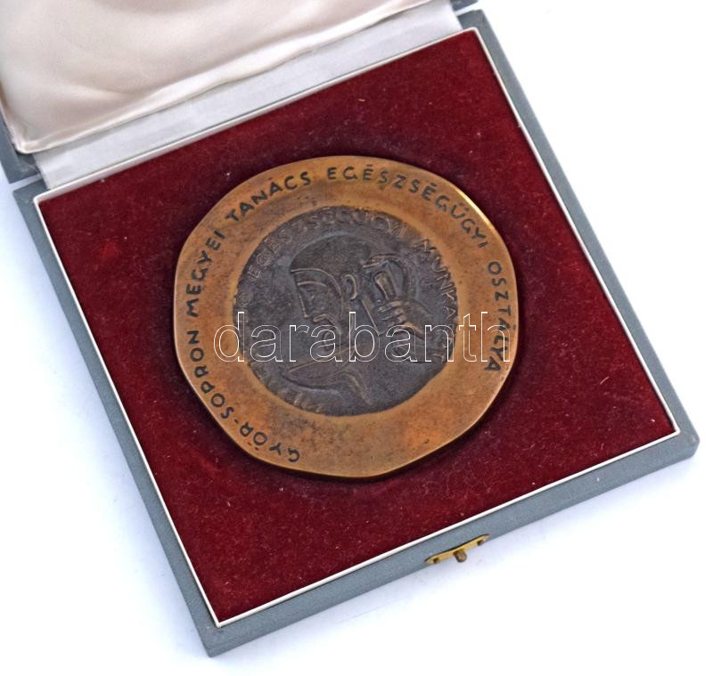 Renner Kálmán (1927-1994) DN "Dr. Petz Aladár 1888-1956 / Győr-Sopron Megyei Tanács Egészségügyi Osztálya - Kiemelkedő Egészségügyi Munkáért" kétoldalas bronz emlékplakett eredeti tokban (97mm) T:AU