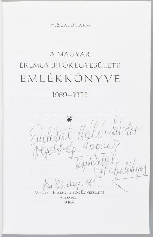 H. Szabó Lajos: A Magyar Éremgyűjtők Egyesülete emlékkönyve (1969-1999). A szerző által dedikált példány! Bp., 1999, MÉE, 410+[2] p. Kiadói papírkötés. Megjelent 1000 példányban.