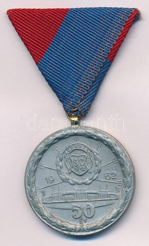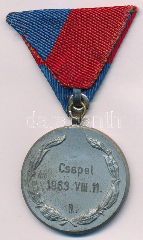 1963. "Csepel SC 1912 - 1962 - 50 év" ezüstözött fém díjérem "Csepel 1963. VIII. 11. - II." a csepeli klub vörös-kék színeit viselő szalagon (40mm) T:AU,XF