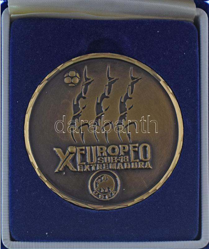 Spanyolország 1994. "Europeo Sub-18 Extermadura" kétoldalas bronz emlékérem (60mm) dÃsztokban, a Spanyolországban, Extermadura (és Badajoz) tartományokban rendezett U18-as labdarúgó Európa Bajnokságról. A tornát Portugália nyerte meg büntetÅ‘kkel Németország ellen, a házigazda spanyol csapat a bronzérmet szerezte meg, Hollandia legyÅ‘zésével (5-2) T:UNC