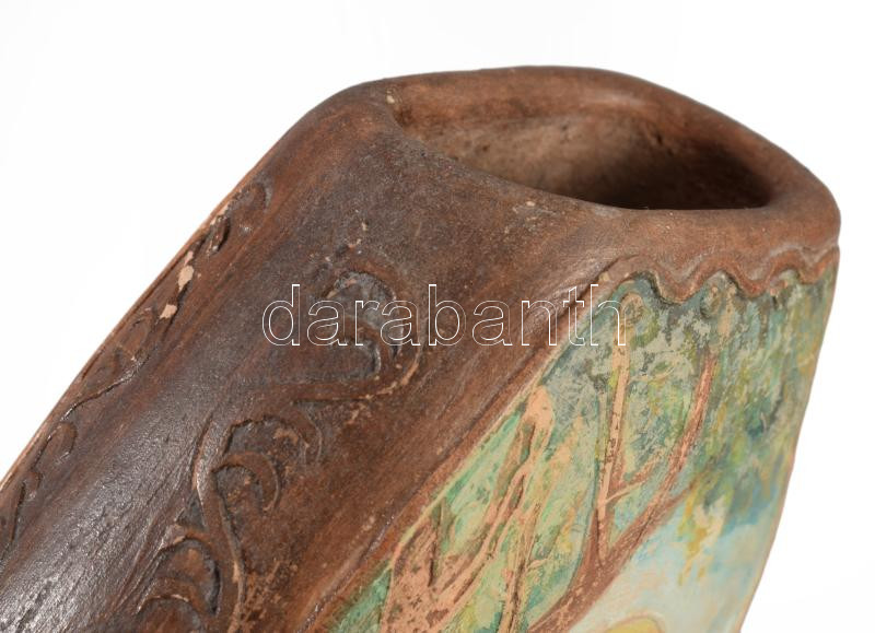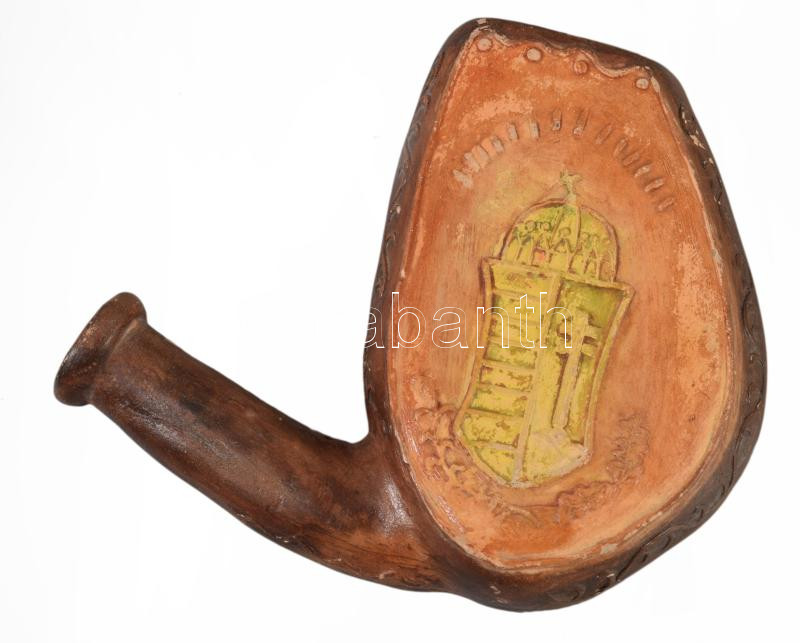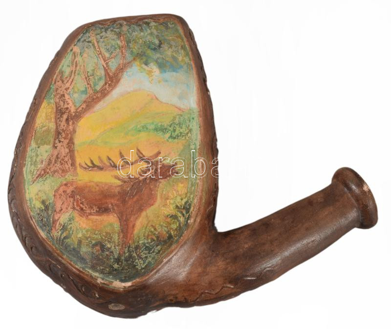 Antik vadászmintás címeres kerámia szarvashívogató, kopással, 12x15 cm