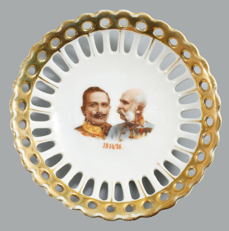 1914-1916 Ferenc Józsefet és Vilmos császárt ábrázoló propaganda tálka. Számozott, kis kopással, d: 11 cm