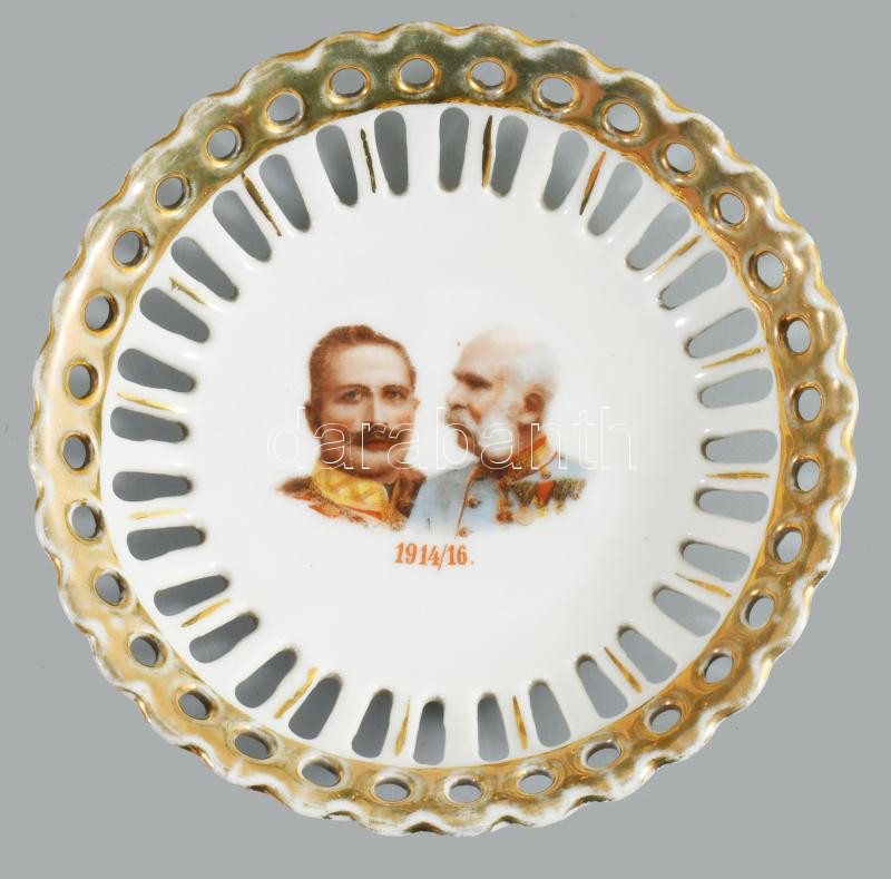 1914-1916 Ferenc Józsefet és Vilmos császárt ábrázoló propaganda tálka. Számozott, kopással, d: 11 cm
