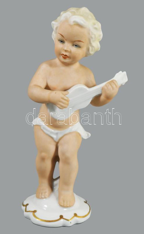 Schaubach Kunst gitározó gyermek figura. Mázas és biszkvit porcelán, jelzett, hibátlan, m: 15 cm