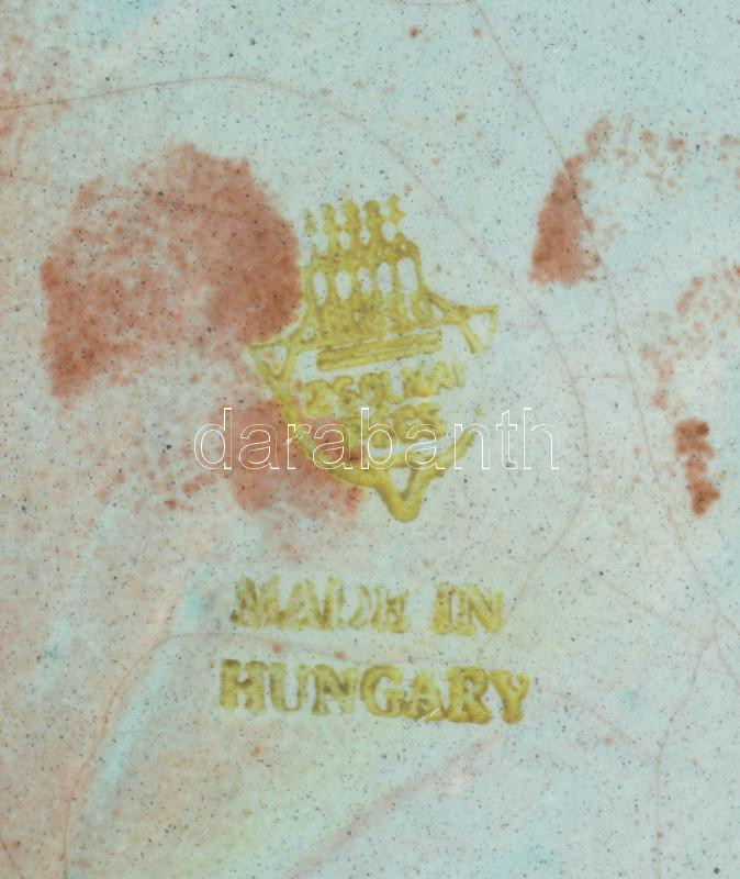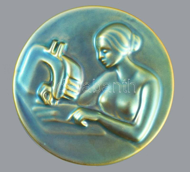 Zsolnay eozin mázas bőrdíszműves plakett, jelzett, minimális mázhibával, d: 12 cm
