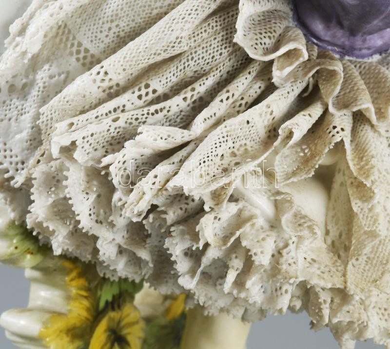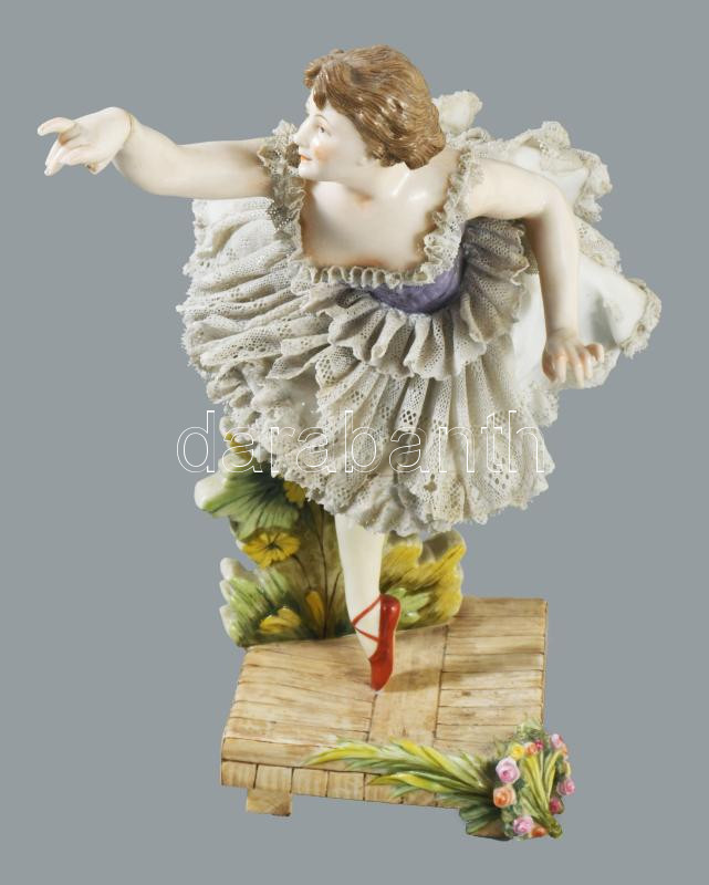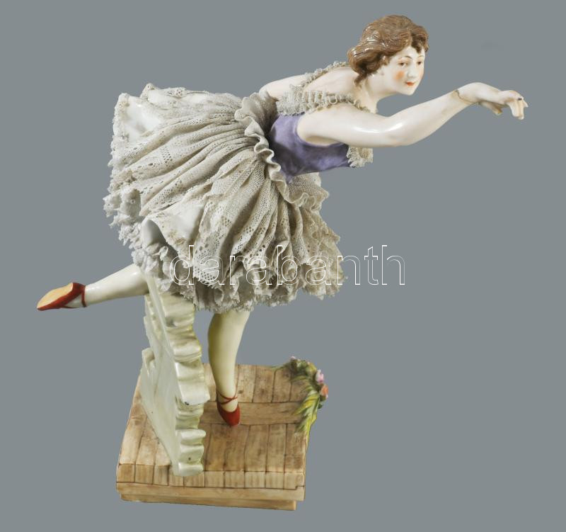 cca 1880-1900 Antik dresdeni porcelán balerina, jelzés nélkül, sérüléssel, restaurálással, m: 27 cm