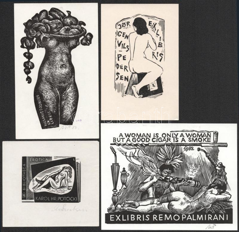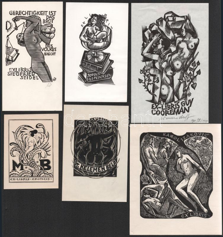 Klf. külföldi alkotók (Avo Keerend, Ladislav Vlodek, Erhard Zierold stb.): 10 db erotikus ex libris és kisgrafika. Klf. technikák, papír, részben jelzett, klf. méretekben. Hátoldalán paszpartuzás nyomaival.