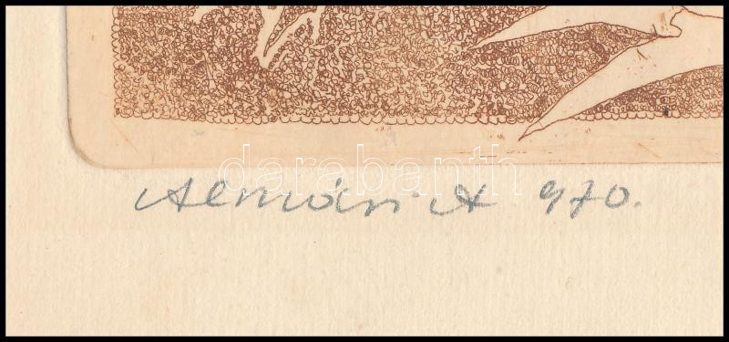 Almásy Aladár (1946-): Alakok (cím nélkül), 1970. Rézkarc, papír, jelzett. Hátoldalán paszpartuzás nyomaival. 19,5x25 cm. Lapszéli hajtásnyommal és ragasztószalaggal. Az életmű korai darabja!