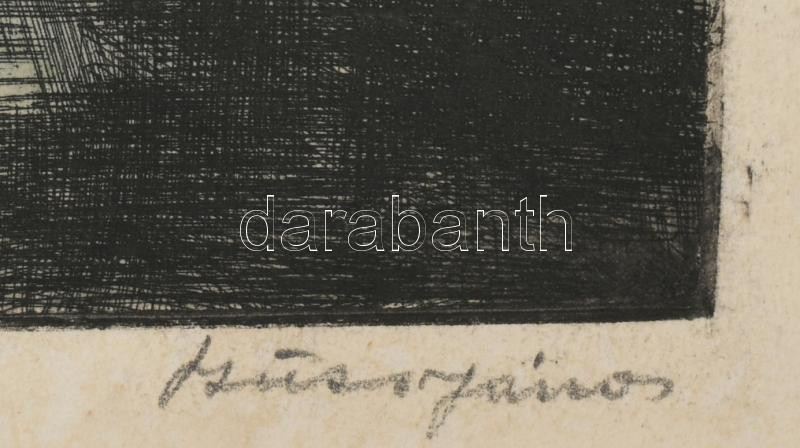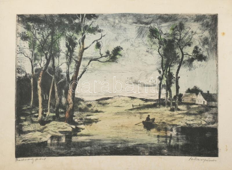 Szűcs János (1917-1995): Bodrogpart. Színes rézkarc, papír, kartonra kasírozva, jelzett. Lap széle kissé foltos, 28×38 cm