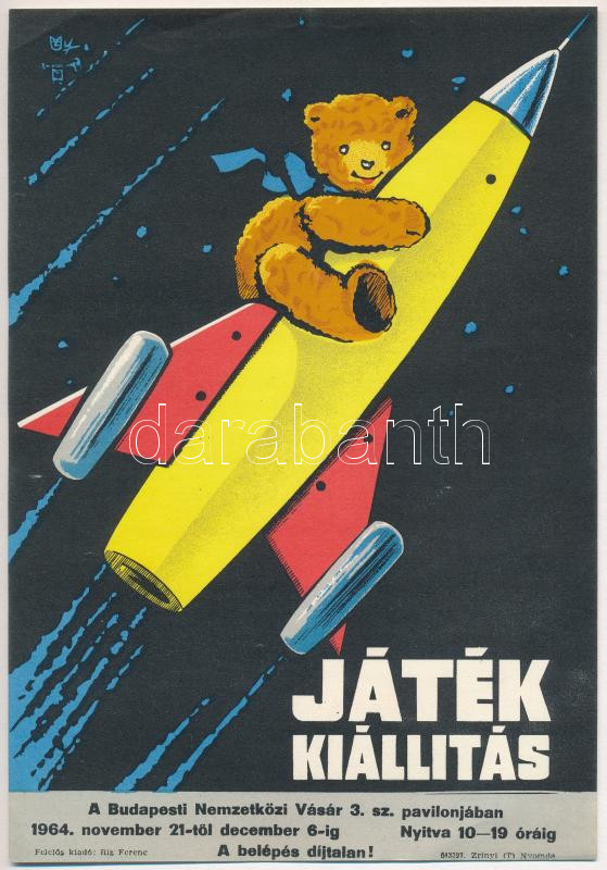 Macskássy János (1910-1993): Játékkiállítás a Budapesti Nemzetközi Vásár (BNV) 3 sz. pavilonjában, 1964, villamosplakát, papír, jelzett a plakáton. Zrínyi (T) Nyomda. 23,5x16,5 cm