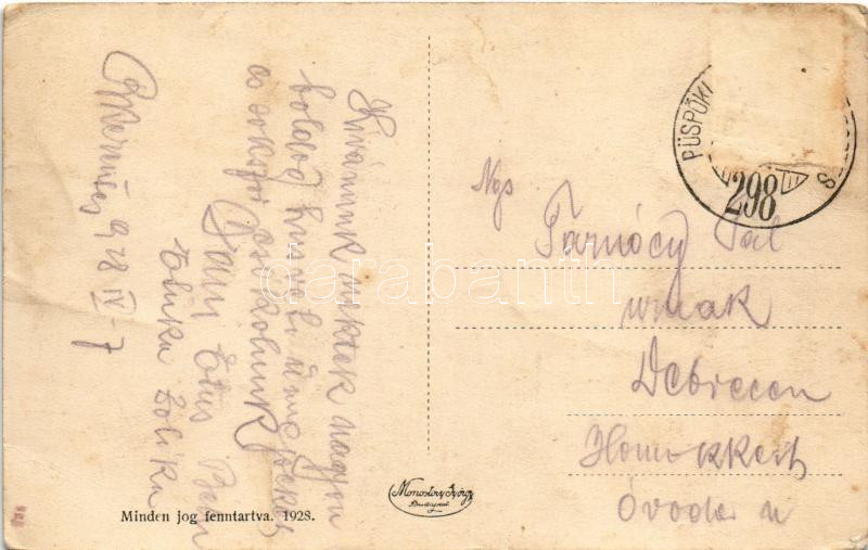 1928 Biharkeresztes, Vasútállomás, vasutasok, Dreher Maul csokoládé és baksör, hírlapárus bódé + "PÜSPÖKLADÁNY - BIHARKERESZTES 298." vasúti mozgóposta bélyegző (gyűrődések / creases)