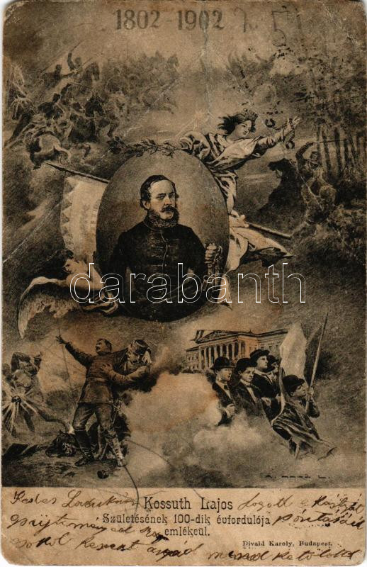 1802-1902 Kossuth Lajos születésének 100. évfordulója emlékéül. Emléklap az 1848-49 Forradalom és Szabadságharc jeleneteivel / 100th anniversary of Kossuth's birthday, memorial postcard with scenes of the Hungarian War of Independence. Divald Károly kiadása (b)