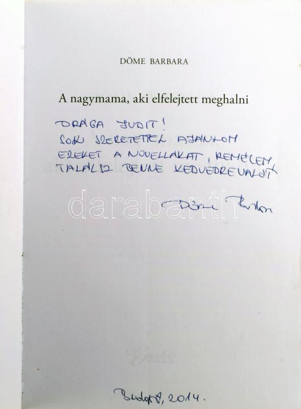 Döme Barbara: A nagymama, aki elfelejtett meghalni. A szerző, Döme Barbara (1973-) író, újságíró által dedikált példány! Bp., 2013, Garbo. Kiadói papírkötés.