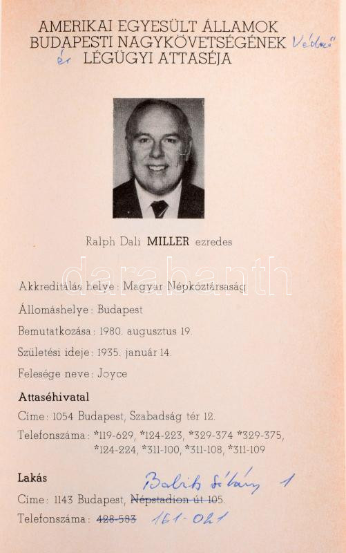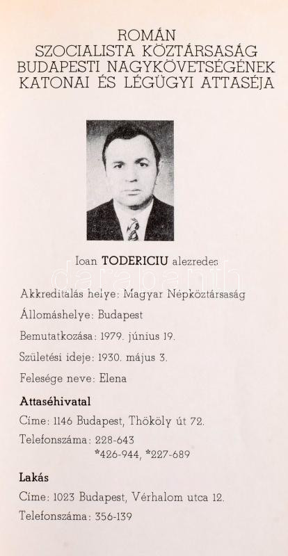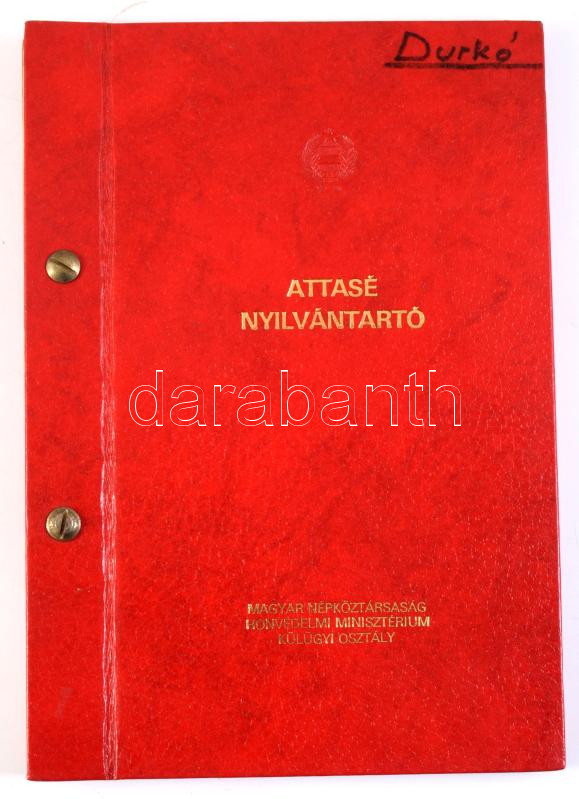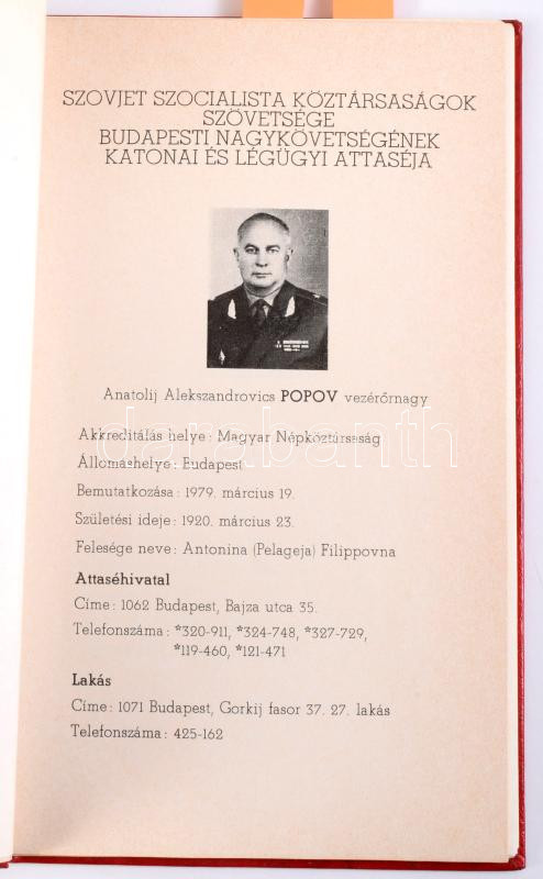 Attasé nyilvántartó. A Magyar Népköztársaságba akkreditált véderő, katonai és légügyi attasé testület nyilvántartója. Bp., 1979, Honvédelmi Minisztérium Külügyi Osztálya, 38 sztl. lev. Benne Csehszlovákia, Szovjetunió, Észak-Korea, Kína, Amerikai Egyesült Államok, Románia, Vietnam és más országok attaséinak fényképével és személyes adataival. Kartonált papírkötésben, néhány lapon kézzel írt javításokkal, kiegészítésekkel.