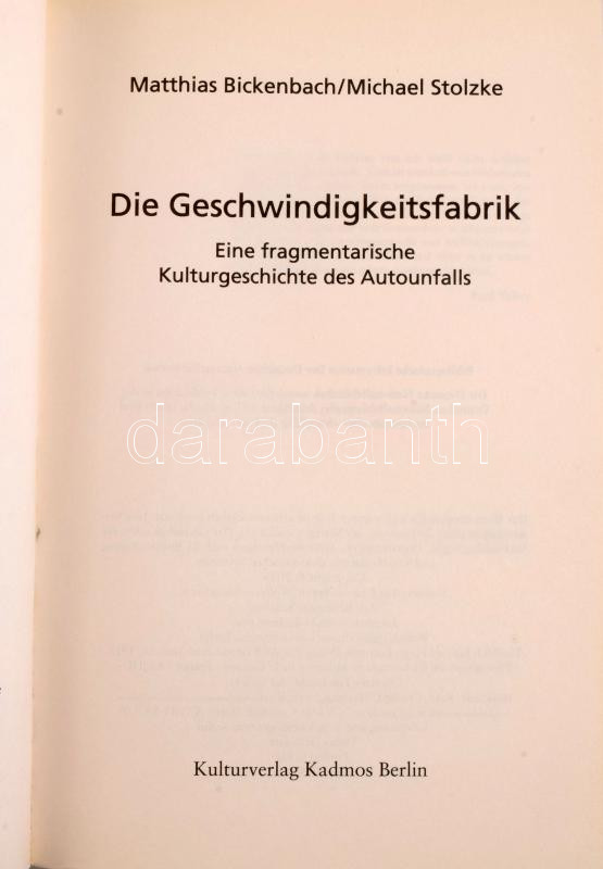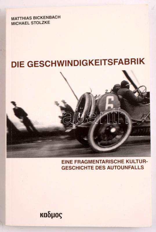 Matthias Bickenbach - Michael Stolzke: Die Geschwindigkeitsfabrik. Eine fragmentarische Kulturgeschichte des Autounfalls. Berlin,2014,Kulturverlag Kadmos. Német nyelven. Gazdag képanyaggal illusztrált. Kiadói papÃrkötés.